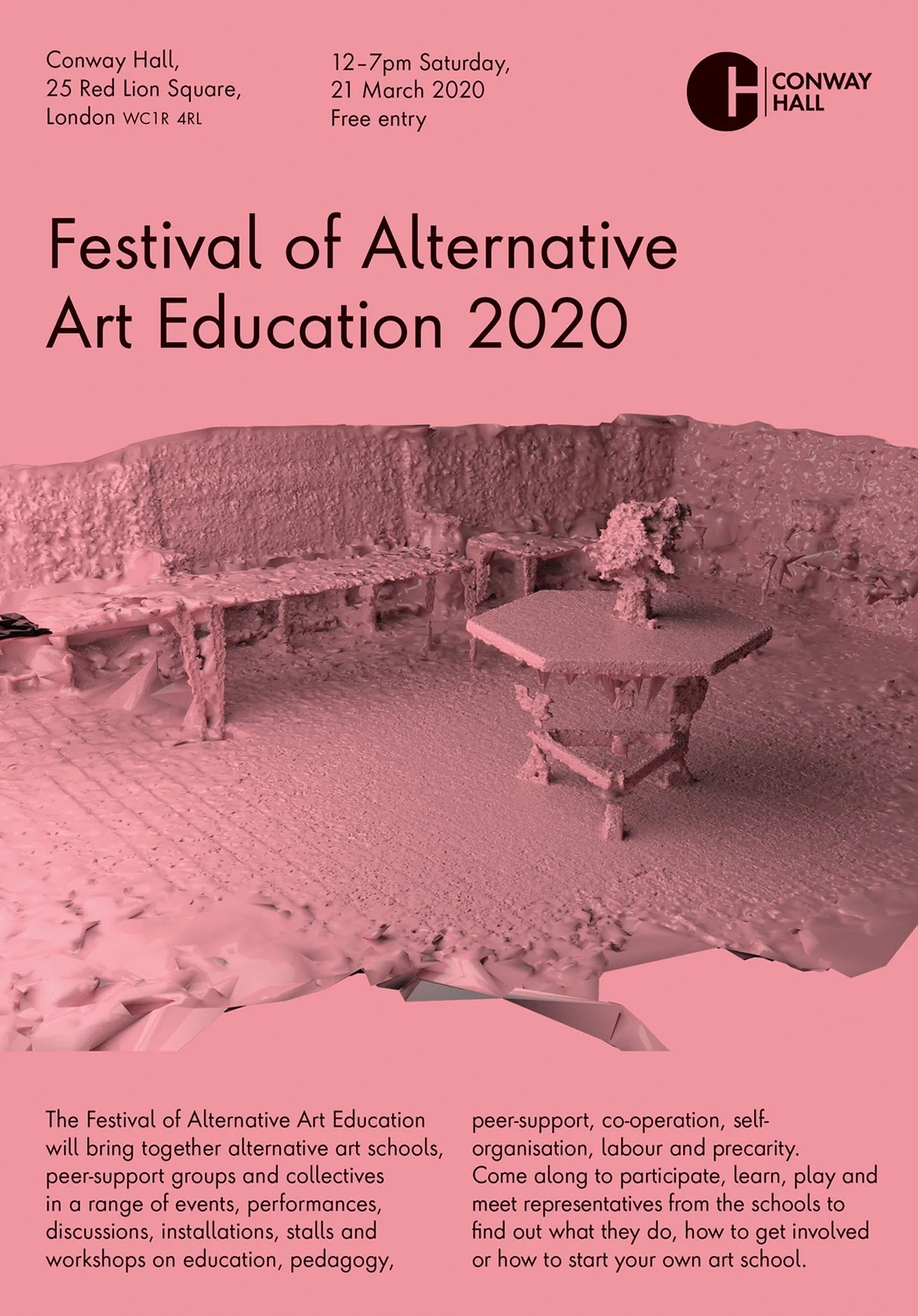 Using photogrammetry, we created 3D models of Conway Hall as a way of visualising a permanent institutional space which many of these grassroots art schools lack. As the festival was rearranged as an online event the meanings of these models have shifted and seem even more pertinent in our current situation.