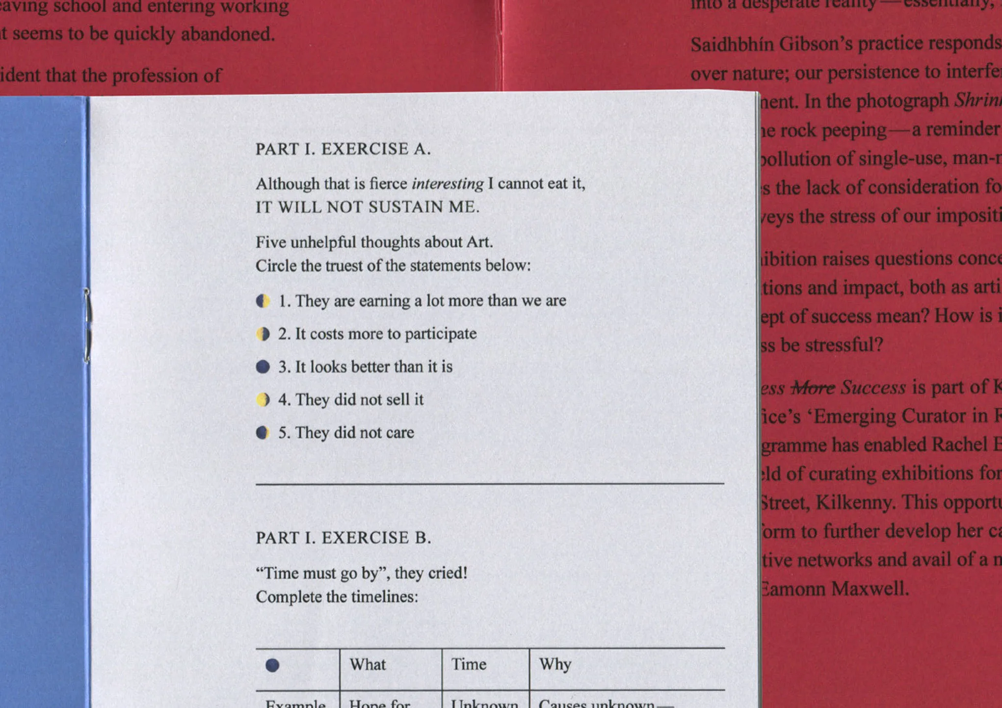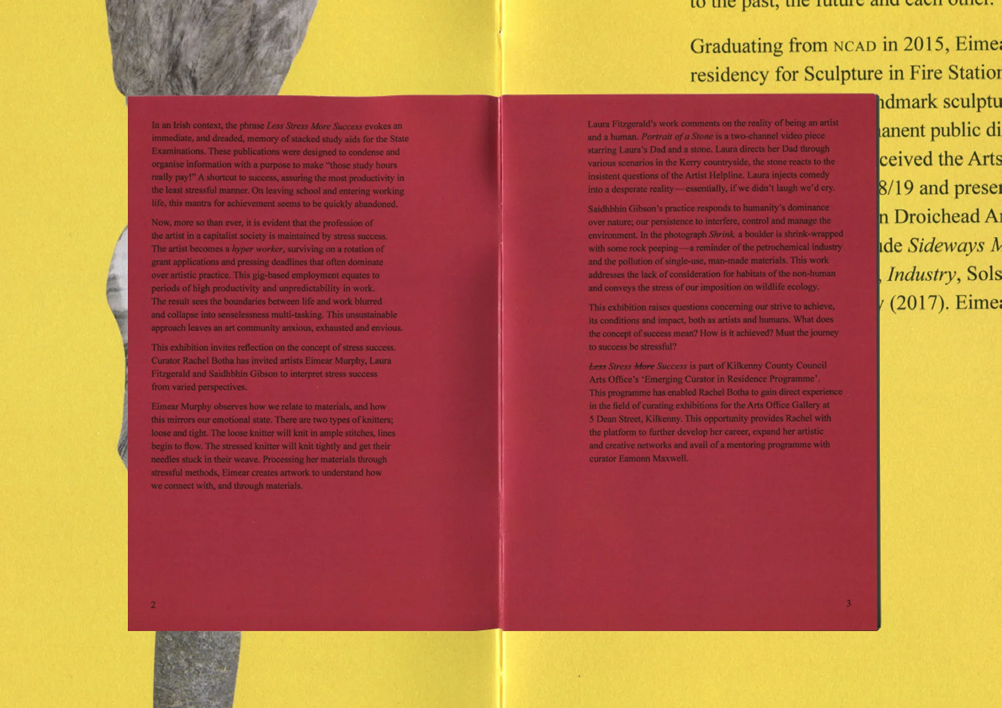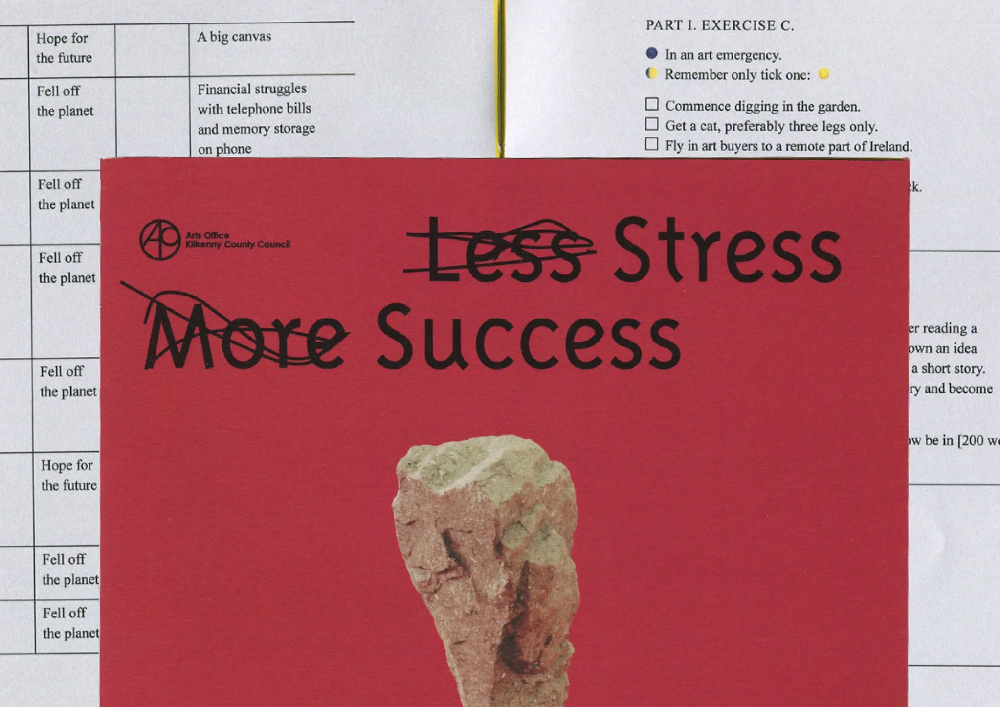 We designed the promotional material to reflect the exhibitions theme. The stress attatched to working as an artist, gets converted into successful objects. Along with Jamie Smyth, we designed the colour and text surrounding the school textbook of the same title. We created a series of rock stacks which are intended to reflect converting stress into success. In an Irish context, the phrase Less Stress More Success evokes an immediate, and dreaded, memory of stacked study aids for the State Examinations. These publications were designed to condense and organise information with a purpose to make “those study hours really pay!” A shortcut to success, assuring the most productivity in the least stressful manner. On leaving school and entering working life, this mantra for achievement seems to be quickly abandoned.