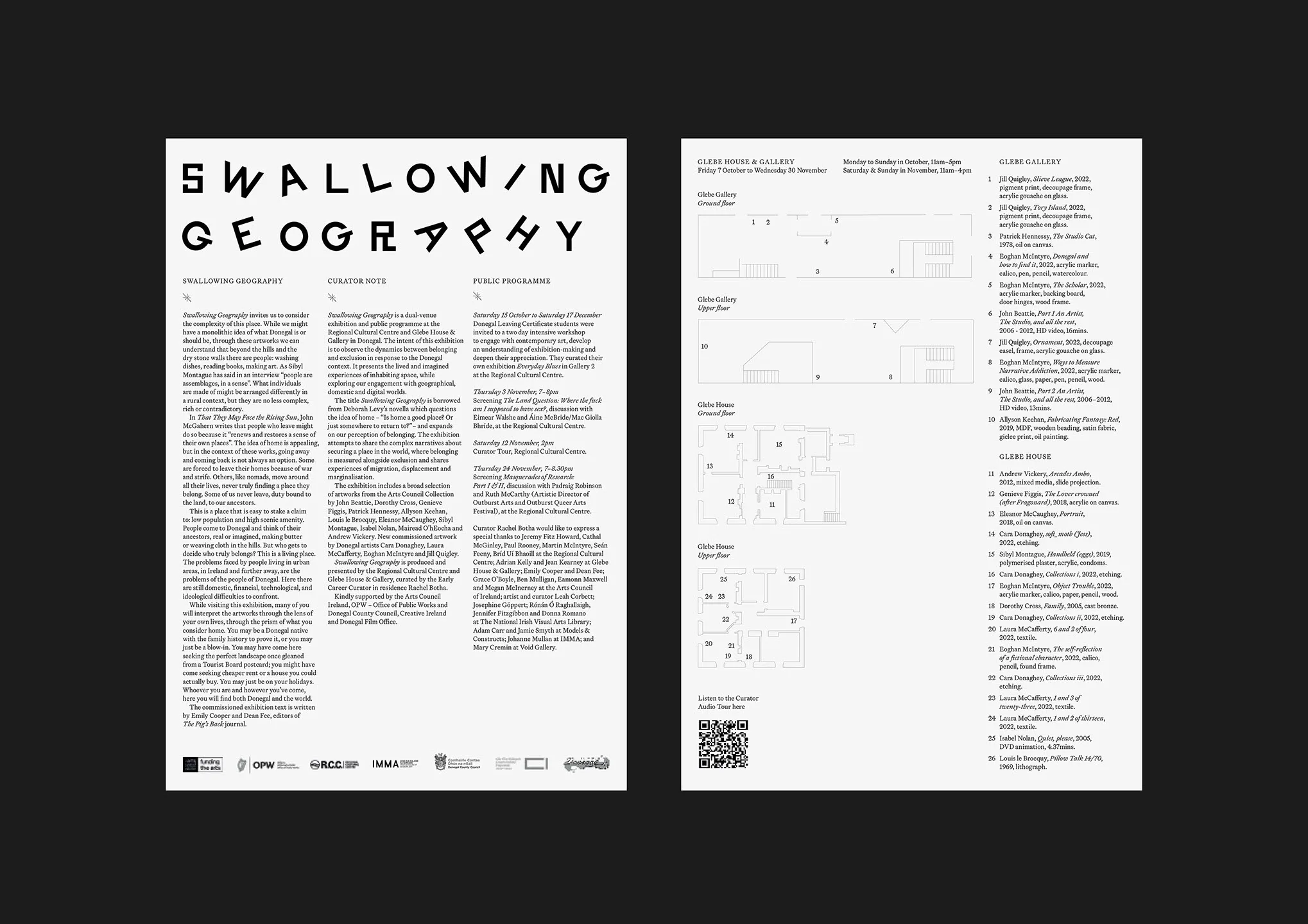 The design of an exhibition identity, promotional material and other ephemera. We produced a piece of work to support the work of a dual venue exhibition in the Regional Cultural Centre and Glebe house, showing work from Cara Donaghey, Laura McCafferty, Eoghan McIntyre and Jill Quigley. As well as presenting a broad selection of artworks from the Arts Council Collection. Dorothy Cross and Louis le Brocquy. Due to the variation between the more than 35 artists on display, we presented work which took a wide approach and kept a relativley neutral visual identity. in 1883 after visiting Donegal Alice Hart set up the Donegal Industrial Fund. She arrived at a time when Donegal had witnessed a series of bad harvests known as the donegal famine. Alice Hart thought that the solution to this poverty could be in the revival of the irish cottage crafts in an attempt to present irish industries, art and customs asW commodities that could be exported. In order to present irish industries to the rest of the world she developed a model village. Her intent was to exhibit and tour irish craft. It was exhibited in the Chicago Worlds Fair, Edinburugh Liverpool, Paris, Dublin and London.